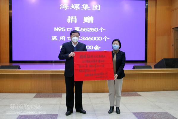 儀式上,高登榜董事長(zhǎng)代表海螺集團(tuán)向省衛(wèi)健委、省紅十字會(huì)捐贈(zèng)了防護(hù)服5100套、N95口罩5.5萬只、醫(yī)用口罩34.6萬只。