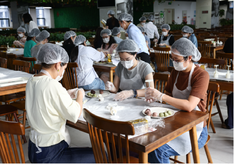 在掌握了基本要領(lǐng)后,員工們紛紛洗凈雙手,系上圍裙,興致勃勃地投入到月餅制作中。盡管很多人都是第一次嘗試,動作略顯生疏——有的在揉皮時力度掌握不均,導(dǎo)致餅皮厚薄不一;有的在包餡時手法不夠熟練,餡料險些“破皮而出”——但這些小插曲并未影響大家的熱情。在姚主席的巡回指導(dǎo)和同事間的互相幫助下,原本生澀的動作逐漸變得流暢,現(xiàn)場充滿了歡聲笑語。